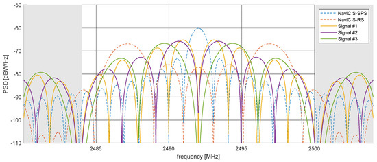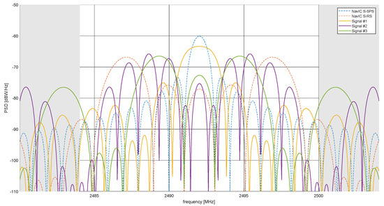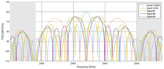 PSDs (power spectral densities) of the chip pulses designed for two 1.023 Mcps signals and a 2.046 Mcps signal in the S band.3.