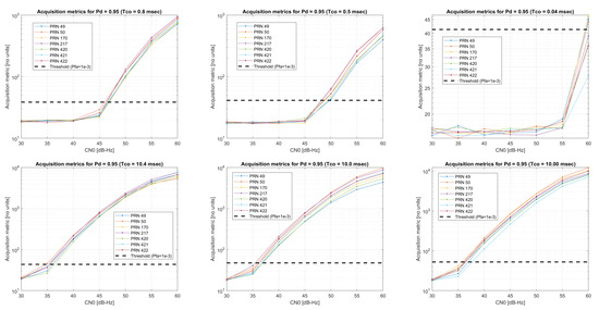 By combining the previous expressions and fixing desired values for and , we can scan over to obtain the acquisition threshold. Table 3 shows the results obtained when considering the whole search space for each type of signal according to the code length and Doppler range.