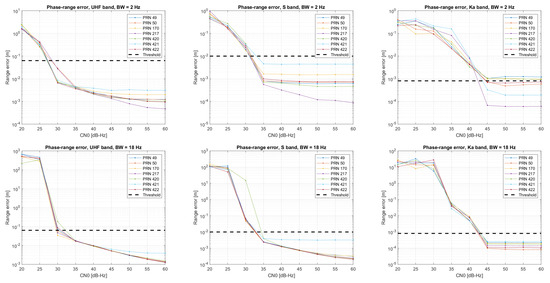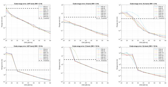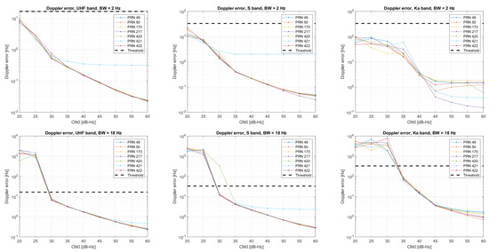 For tracking analysis, the procedure consists in performing the acquisition of noise-free data and starting tracking with a wide loop bandwidth (40 Hz) in order to safely reach a steady state in a short time interval and to then include additive white Gaussian noise and to set a given loop bandwidth. Then, the resultant code, phase and Doppler evolution are compared against the corresponding models to estimate the error values as the standard deviation of such differences over the given interval (from seconds 3 to 4) and averaged after 10 different iterations. Figure 2, Figure 3 and Figure 4 provide the code, phase and Doppler output error results for the loop bandwidth values employed during the theoretical assessment. In order to limit the number of different combinations, the same loop bandwidth is applied to the three different loops of the implemented architecture. The integration time is set to the code period of the corresponding wide band component. Regarding the obtained results, the code-tracking thresholds that can be derived from the graphs are well aligned with the theoretical values for third-order loops given in Table 5 (recall that our second-order DLL is aided by a third-order PLL/FLL loop). On the other hand, the frequency results seem to benefit from the combination with the phase discriminator in the loop architecture. However, such a combination also has an impact on the phase, which provides more robust results for Hz (tracking is achieved), while worsening the expectation when using a larger loop bandwidth value (the thresholds seem to be bounded by the performance of the FLL). It is also relevant to point out the results in frequency and phase from PRN 421, which are probably due to the fact that this was the satellite with the highest Doppler drift.
