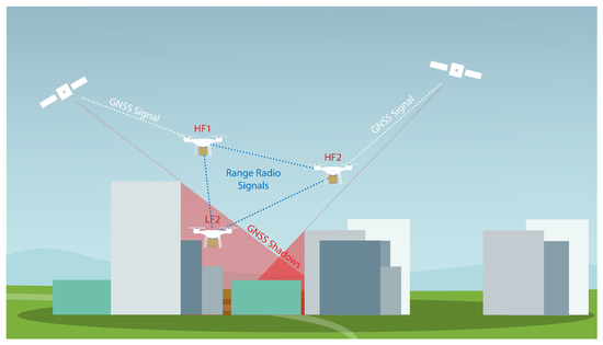Swarm geometry of High Flying UAS (HF) with good GNSS reception and Low Flying UAS (LF) in a GNSS shadowed region, all connected via range radios.