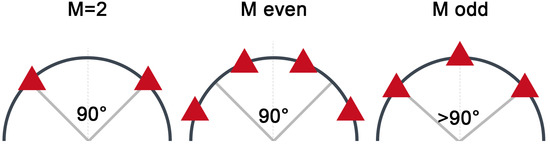 Applying the knowledge that one HF is located on the symmetry axis, i.e., , Equation (20) shows the optimal azimuth angle (angle between the mirror axis and the HF) for M being odd: