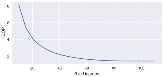 Here, is the minimum distance from the HF to an LF, which comes from the assumption that HF should have an elevation angle as low as possible to increase the observability of the LF position within the horizontal plane. Furthermore, it can be seen that within the safety buffer interval, the HDOP can be approximated using a quadratic function.