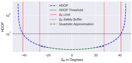 Here, is the normal vector of the vector and the skew-symmetric matrix of . The objective function is then formed as a sum of squared errors (SSE), which is supported via the quadratic approximation of the HDOP error as a function of , as shown in Figure 4. Together with the minimum and maximum range constraints and the restriction of the feasible area to the valid azimuth areas, the optimization problem is defined as follows:
