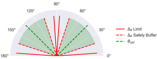 To visualize the effect of the safety buffer on the feasible area for HF positioning, the limits are shown in polar coordinates in Figure 5. It can be seen that rather than a direction, the feasible area is now a valid range in which the HDOP is likely to be below the value of .