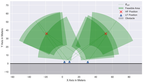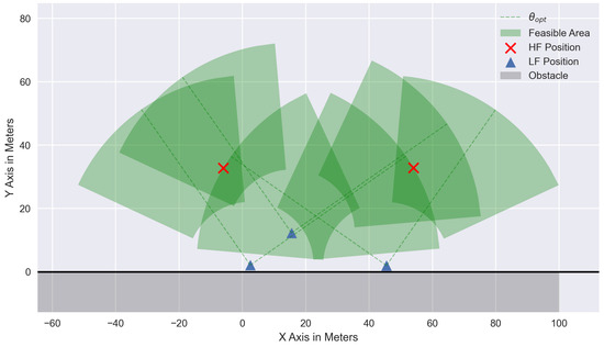 To illustrate the effectiveness of the feasible azimuth areas, an optimization example is given for HF and LF. For efficient computation, the problem is formulated using Cartesian coordinates. Instead of calculating the non-linear value of , the normal distance to the vector is calculated, which underestimates the HDOP when close to the LF and overestimates it when further away. Note that the feasible azimuth areas are defined relative to each other. Here, both lines are separated by from each other. By rotating the symmetry axis slightly in one direction, one could improve the HDOP as the vectors might form a better joint geometry with those of other LF. Therefore, the optimization variables do not only consist of the HF positions, , but also of the change in the symmetry axis–angle from , . The orthogonal distance to the vector is then given as
