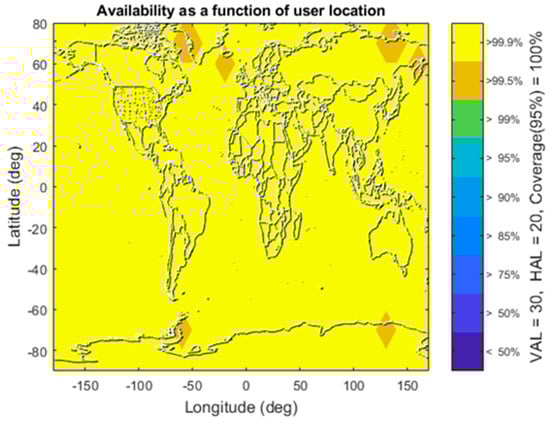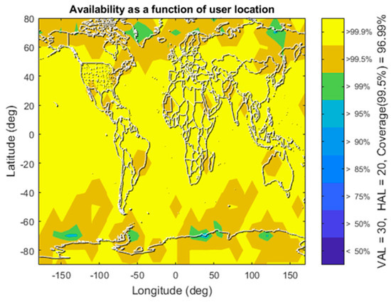 By reducing the URA to 20 cm and satellite nominal bias (Bnom) to 10 cm, as a result of the correction from the HAS, combined with the PL propagation from the IMU and Kalman filter, the following simulation results are obtained (see Figure 2). The availability map below is the result for the open-sky scenario, where a VAL of 30 m and HAL of 20 m was applied with the original Psat and Pconst values (From stakeholder interviews, the requirements have been determined for operational scenarios such as U-Space, geofencing and search and rescue. In open sky, these operations require an accuracy of 10 m (1 m in urban environment), 95% availability (99.5% in urban), a continuity of 10−5/hour, integrity risk of 10−7, time-to-alert of 6 s and alert limits of 20 m horizontally and 30 m vertically). As can be seen, most of the globe exceeds 99.9% availability. In fact, the 95% availability is reached for the entire volume simulated. Without the need for integrity commitment by HAS, the open sky requirements for integrity can therefore be reached.