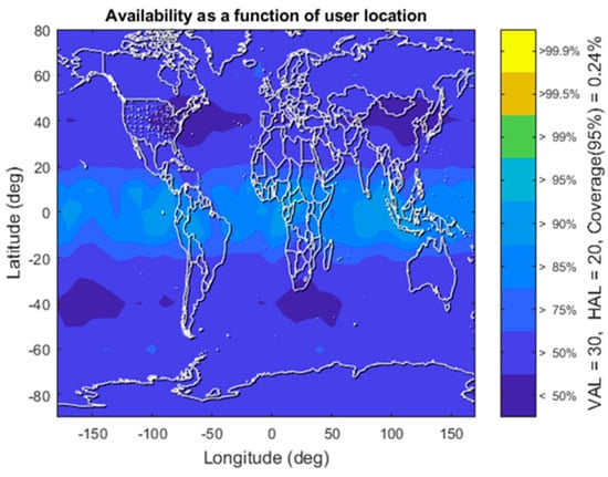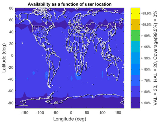Without the need for integrity commitment, i.e., reduced satellite and constellation prior fault probabilities, as well as further accuracy improvements, the availability requirement is achieved for most of the service volume. Only at some high (70 degrees) latitudes, further improvements are required. At these locations, the suburban assumption is questionable, however, and open-sky performance is more likely. Therefore, the displayed results were deemed satisfactory and no further parameter assessment was performed.