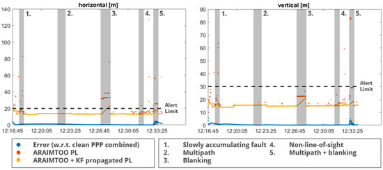 Starting with the most significant impact visible, the protection level is severely impacted by the number of satellites visible due to blanking (indicated by the grey Section 3 and Section 5). Even though the snapshot algorithm causes the horizontal protection level to exceed the alert limit immediately, the fusion with the IMU data allows for an extended duration of the availability. Such behavior allows for instance availability while moving through an underpass or through deep urban canyons for short durations. After roughly 45 s (during feared event 3), the alert limit is exceeded, which is a duration depending on the specifications of the IMU and implementation of the Kalman filter. Furthermore, it is interesting to note that especially during feared event 3, the actual error with respect to the open-sky ‘truth track’ is very small. This indicates there is more room for algorithm improvement in both the calculation of the protection level, for instance with tighter bounding, as well as the propagation algorithm.