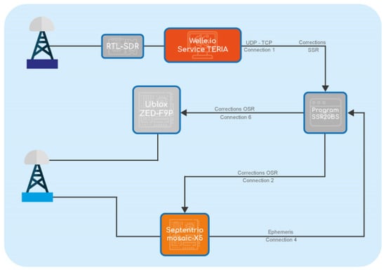 The DAB+ transmitter uses SSRZ, a compressed and compact state space representation corrections format developed by Geo++ [4]. The main advantage of using this type of corrections is that there are no problems with two-way server–user communication, as in NRTK. Moreover, using SSRZ corrections aims to solve the computation of the position, even if it is with latency.