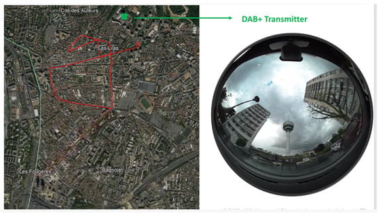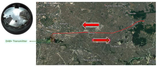 The session lasted 6 km around the transmitting antenna, which was located in Romainville (France). This test session lasted 30 min. The results (Figure 3) show that, in some sections, the accuracy was acceptable when the user stayed close to the transmitting DAB+ antenna (<10 km). Lower performances might result from broadcast limitations in urban environments.