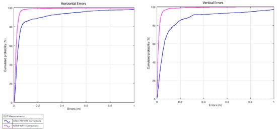 Horizontal errors were between 3 cm and 50 cm, and vertical errors were between 5 cm and 80 cm. These errors were due to the quality of the DAB+ signal. Indeed, in this scenario, corrections on DAB+ signals are often lost in urban environments. This loss is mostly due to the non-optimization of the DAB+ prototype antenna for the good reception of signals. Furthermore, the use of a single transmitter for DAB+ limited the signal coverage area and caused gaps. This can explain the different errors in the position. However, the accuracy of the position was around a few centimeters, with a convergence time of less than 5 min.