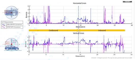 To validate the proposed corrections solution, the “Record & Replay” technique was used [5]. It consisted of digitizing GNSS signals during a normal field test. During the test, a high-grade inertial navigation system was embedded to calculate, in post-processing with post-processing Kinematic (PPK) and inertial hybridization, a high-accuracy trajectory. Once the data were collected and validated, replays were executed in the laboratory. GUIDE compared the performances obtained using classical NRTK corrections and the ones obtained with the new SSRZ corrections. For this phase, corrections were replayed and broadcast using the NTRIP protocol. Once validation proved that the SSRZ corrections were able to provide similar accuracy and availability of high-precision PVT solution as the RTK, the real-life test took place.