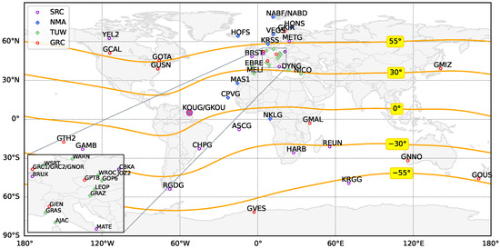 These stations are therefore divided into four groups according to the different geomagnetic latitude zones. Stations considered by individual entities are marked with different colours; in the case of TUW, in the mid-latitude region, 5 stations per quarter were considered. The station choice for each quarter was mainly dependent on the site location within the mid-latitude region and RINEX data availability (2019 Q1: AJAC, GRAS, JOZ2, LEOP, NICO; 2019 Q2–2019 Q4: AJAC, GRAS, LEOP, NICO, WROC; 2020 Q1–2021 Q4: EBRE, GRAS, GRAZ, NICO, WROC). Due to urgent maintenance activities at the Data Centre of the Bundesamt für Kartographie und Geodäsie (BKG) of the International Geodesy Service (IGS), and hence RINEX data unavailability, the majority of used validation sites had to be replaced in the 1st and 2nd quarter of 2022 (2022 Q1: DYNG, GRAS, MELI, NICO, WARN; 2022 Q2: DYNG, EBRE, GOP6, GRAS, WSRT).