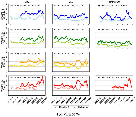 Monthly means of the daily (a) HPE 95% and (b) VPE 95% for the Nequick G and Klobuchar models. The top panels in (a,b) show results for high latitudes, the middle panels for middle latitudes divided into northern and southern hemispheres, and the bottom panel for low latitudes. The left panels present the GRC, the middle panels the SRC, and the right panels the NMA/TUW results. The text line at the top of each subplot includes information about the number of used stations (e.g., #5) and the average together with standard deviation over the complete period for the NeQuick G solution (e.g., N: 2.4 ± 0.5 m) and Klobuchar solution (e.g., K: 4.2 ± 0.5 m).