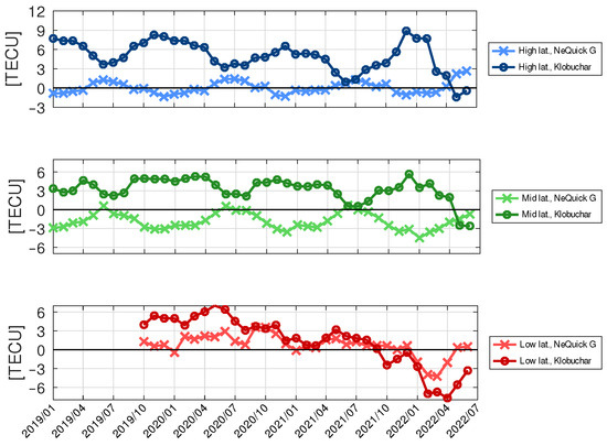 Figure 3 shows the monthly mean VTEC error for the high/middle/low latitudes and for the NeQuick G and Klobuchar model for the NMA and TUW network of stations as described above. Annual variations of the errors can be seen for the high and mid-latitudes. These variations are of opposite signs for the two models, i.e., when the Klobuchar-derived error decreases, the NeQuick G-derived error increases, and vice versa.