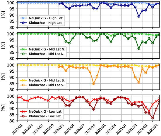 This section describes the monthly mean TEC availability results for the high/middle north/middle south/low latitudes and for the NeQuick G and Klobuchar model for the GRC network of stations as described above. Numerical results are presented in Figure 4. As explained in Section 2.3, the Galileo SF ionospheric algorithm specification serves as a benchmark for both models. Being the specification not designed to fit the Klobuchar model, its worst performances with respect to the NeQuick G one are evident. However, the patterns of the Klobuchar follow as seeing for the VTEC accuracy a seasonal variation, showing the worst results during equinoctial months. On the contrary, NeQuick G performs better in the middle south, middle north, and high-latitude regions. In both models, this behaviour is more visible in low latitudes, in agreement with the disturbed ionospheric conditions at equatorial regions. In addition, during the last period analysed it is observed that the performances for both models are worst in the low-latitude regions. As described in Section 3.1, this time series is not long enough to conclude that it is driven by the 11-year solar cycle.