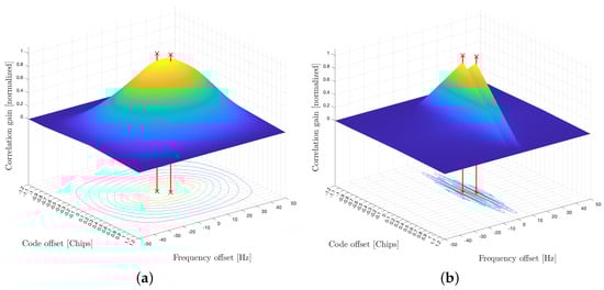 Figure 2a shows the theoretical (i.e., noise-free) CAF for 20 ms integration for a multipath interference scenario. An LOS signal with zero code delay and frequency offset represents the correct peak. An NLOS signal with equal power, a code offset relating to 40 m, and a carrier frequency offset of 5 Hz represents a multipath interference. It is a challenging scenario as both components have the same power (e.g., such as for a reflection from a large metal surface). As a result, the Delay-Locked Loop (DLL) in tracking is expected to have a mean pseudorange bias of 20 m. It will significantly affect the PVT solution.