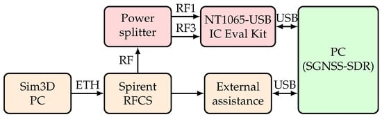 Previous investigations with S-GNSS used real-world data [10,12,13,14]. Although these are great approaches to demonstrating the practical benefits of the technology, it does not allow for systematic performance analysis. Therefore, this paper uses a systematic approach using an RFCS. Figure 3 shows the test setup with a Spirent® GSS7000 (https://www.spirent.com/products/gnss-simulator-gss7000 (accessed on 13 May 2023)) RFCS to create the synthetic GNSS signals and the NTLAB® NT1065-USB (http://ntlab.com/section/sec:v:44979.htm (accessed on 13 May 2023)) RFFE to receive them.