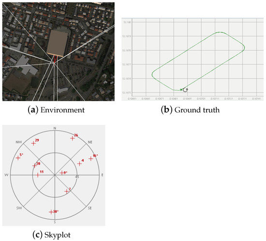 A PC running Spirent® Sim3D™ (https://www.spirent.com/products/multipath-and-obscuration-simulation-sim3d (accessed on 13 May 2023)) Multipath Simulation Software, developed by Oktal-SE (https://www.oktal-se.fr/ (accessed on 13 May 2023)), generates a realistic multipath scenario. The Sim3D™ and GSS7000 combination allows for controllable and repeatable tests, which is ideal for systematic analysis and benchmarking. Furthermore, the same scenario can be run with and without multipath interference, allowing for a direct comparison with the same satellite constellation and trajectory to analyze the impact of multipath interference.