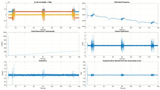 Figure 6 shows the tracking results of PRN30, which has a lower elevation and is opposite the large building, resulting in significant reflections from the building. Significant oscillations and noise are visible in tracking the observed multipath interference. It demonstrates how multipath interference degrades the receiver tracking performance. In particular, it shows that the multipath interference results in position-dependent distortions that exceed the effects of thermal noise in tracking. For example, compare the variance in the graphs between 25 s and 35 s (i.e., close to the building) with considerable multipath interference to the times between 45 s and 60 s (i.e., far from the building) with mostly thermal noise. As a result, the errors significantly influence later pseudorange determination, which will degrade the position solution. The purpose of Supercorrelation™ is to identify these multipath interference components and to suppress them.