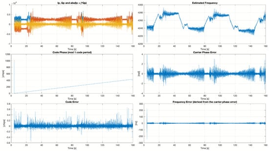 First, Figure 5 shows the tracking results of PRN07, which has a high elevation with high carrier-to-noise density ratio (), resulting in generally good tracking performance. However, there are some disruptions (e.g., between 10 s and 20 s) caused by multipath interference when the receiver moves past the building to the west of the trajectory.