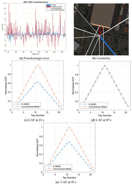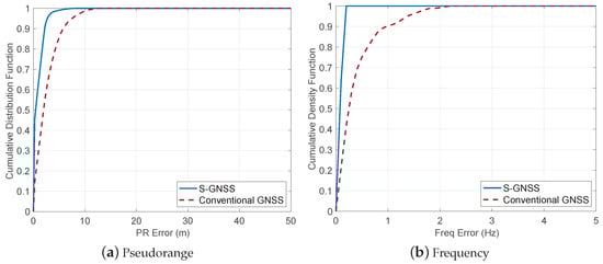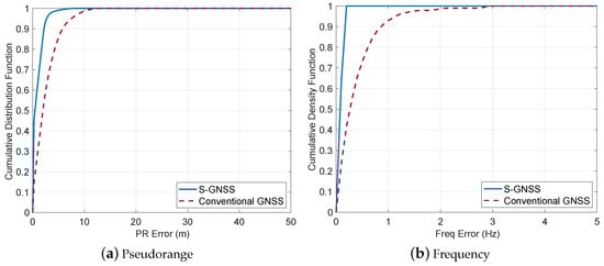 S-GNSS processing is now applied to the scenario. Figure 7 shows the pseudorange errors over time along with the geometry of the satellites (highlighted in blue) and selected CAFs (blue is without S-GNSS correction, red is with) for PRN07. As this satellite is less frequently impacted by multipath interference, the CAF is not always improved by the S-GNSS processing (e.g., CAF at 87 s). However, there are still many cases—even with this high elevation satellite—where S-GNSS enhances the performance. It is emphasized in Figure 8 where the error Cumulative Distribution Function (CDF) for the pseudorange and frequency measurements are displayed. The errors after S-GNSS processing are significantly reduced; for example, the 90% pseudorange error is reduced from 5 m to 2.4 m after applying S-GNSS.