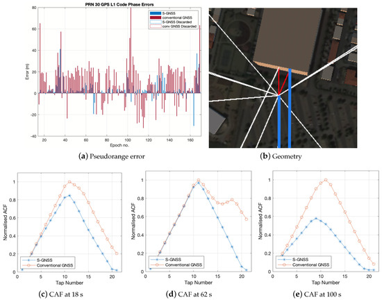 Figure 9 shows the processing results for PRN30, where the multipath interference is more present. In the CAFs, there are even multiple peaks visible. In this case, applying S-GNSS significantly improves the pseudorange and frequency measurements, as shown with the CAFs in Figure 10.