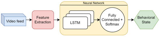 We have shown that an RNN-based network may be suitable for classifying behavioral states using video recordings. We have shown a feature extraction method that is one possible way to create an input that can be used by these networks. We hypothesize that the presented automated behavioral state classification architecture may later be suitable to replace human observation to a certain level.