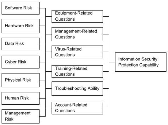 A five-point Likert scale was used in the questionnaire. Scores were given to strongly agree, agree, average, disagree, and strongly disagree with the organization’s ability for information security, with one point representing no protection and five points representing sufficient protection. The reliability of the questionnaire was analyzed using Cronbach’s alpha coefficient [13,14]. The internal consistency was also tested with Cronbach’s alpha coefficient. The overall reliability was 0.949. The reliability of questions of software risk, hardware risk, data risk, network risk, physical risk, human risk, and managerial risk was 0.796, 0.639, 0.709, 0.790, 0.724, 0.751, and 0.813, all of which showed acceptable reliability and credibility.
