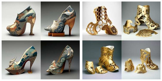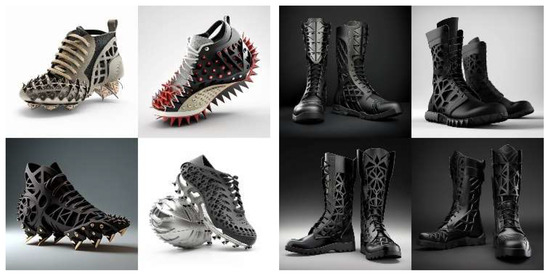 The impact of GAI was explored on the application of both conventional and unfamiliar categories in the image generation process using Midjourney. Specifically, it investigated how GAI influenced the generation of different types of footwear designs. It was assumed that the existing subcategories of footwear were considered as known archetypal images while defining unfamiliar shoe styles, such as “protective devices for the feet”, which required a careful redefinition of component attributes. A lack of archetypal definitions increases conceptual creativity and flexibility but entails greater risks. On the other hand, explicit subcategory definitions may reduce the risk in design thinking but potentially limit creativity and innovativeness. To test these hypotheses, seventeen sets of footwear design proposals were generated using prompts with obviously different word counts and image styles. After decreasing homogeneity and similarity, ten sets of outcomes were selected for expert evaluation. Table 1 provides a summary of ten prompts for Midjourney V4. Then, all ten sets of results generated by Midjourney are shown in Figure 1, Figure 2, Figure 3, Figure 4 and Figure 5.