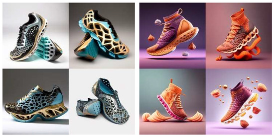 Artificial intelligence (AI) has been rapidly adopted by the industry, revolutionizing various aspects of our lives. Generative artificial intelligence (GAI) has especially shown extensive and profound advancements and significantly impacted the global economy [1]. GAI generates new content of text, images, or audio, based on training data. Prominent examples of GAI include GPT-4 and Midjourney, both of which are widely adopted, impacting work and communication practices [2]. The development of AI traces back to 1956 when John McCarthy coined the term “artificial intelligence.” In 1997, the supercomputer “Deep Blue” achieved a significant milestone by defeating the world champion chess player and establishing a clear benchmark in AI capabilities. More recently, in 2022, Midjourney, Inc. (San Francisco, CA, USA) released the Midjourney Discord bot. The refinement of large language models, such as ChatGPT, has been developed via various methods, including supervised learning, machine learning, and reinforcement learning. Moreover, latent text-to-image diffusion models such as Stable Diffusion and Midjourney have been widely applied in visual GAI software. Due to its capacity to process and analyze vast amounts of data quickly and accurately, AI is already being employed in diverse applications, employing natural language processing and autonomous vehicles. Its prevalence is expected to continue soaring in the coming years [3]. Machine learning is one of the key techniques used in AI. By learning from patterns and features in previous data, AI combines vast amounts of information with fast and iterative processing and intelligent algorithms to generate new content. In machine learning, AI is trained to identify patterns and make predictions based on existing data. By automating tasks that are currently handled by humans, AI allows for more time and resources for other activities that require human attention. In other words, its potential to enhance efficiency and productivity leads to cost savings, quicker delivery times, and improved overall performance [3]. This presents both opportunities and challenges across a wide range of professions and research areas, including education [4], healthcare [5], marketing [6], and transportation [7]. The application of GAI has been extensively explored in various design research, such as architectural design [8], fashion design [9], household appliance design [10], and industrial design [11]. In particular, Taiwan has gained recognition for its advanced footwear manufacturing technology and thriving footwear industry cluster.