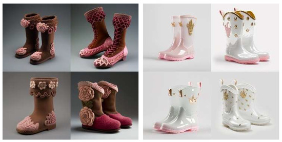 Generative results of children’s shoes with Vivian Westwood style (left) and children’s rain boots with Vivian Westwood style (right).