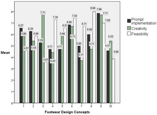 The application of GAI in footwear design was evaluated from three perspectives. The results of the quantitative analysis showed that footwear designs referencing particular cultural styles demonstrated creativity and prompt implementation, especially in the case of the ninth set of results. However, deliberate avoidance of the specification of subcategories for footwear and refraining from incorporating specific cultural styles hindered the high integration of design definitions as suggested by prompts. In design creativity, the results exhibited a negative correlation between creativity and feasibility. For instance, the fourth, seventh, and eighth sets lacked creativity due to their excessive feasibility and similarity to existing products. Moreover, the majority of low feasibility resulted from shattered designs or sharp features that conflicted with comfort requirements, resulting in relatively low feasibility. Expert evaluations also indicated that GAI lacked integration, particularly when design conditions interfered with each other. Additionally, GAI’s prediction of material wearability during usage still requires improvement. These are areas where GAI can potentially enhance its design applications in the future.