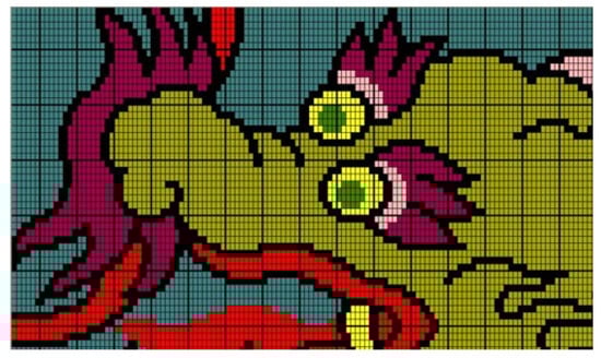 For the jacquard machine, the structure of multiple treadles and harnesses is designed to be a pattern storage method for fabric production. The information of the pattern is stored in several healds. In the weaving process, the healds are lifted in sequence according to information on the fabric []. Aside from the complexity of its pattern, the relationship between warp and weft is described as “passing through” or “not passing through” depending on the “lifting” and “not lifting” of the warp in weaving. The concept is equivalent to the symbols “0 and 1” in computer coding []. If the color yarn and weave changes are added, the pattern is designed as a “color matching pattern” [], so the weaving sequence of warps is a loom-specific program translated based on the textile patterns. Therefore, the “lifting” and “healding” processes realize the textile pattern, and the pattern card is a decoder.