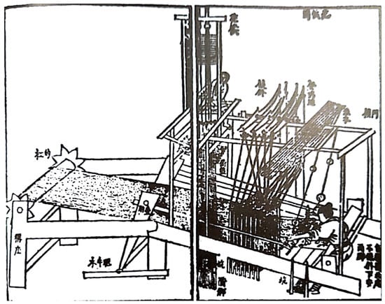 - Hsiao, K.H.; Yan, H.S. Structural Synthesis of Ancient Chinese Foot-operated Slanting Loom. Proc. Inst. Mech. Eng. Part C J. Process Mech. Eng. 2011, 225, 2685–2699. [Google Scholar] [CrossRef]