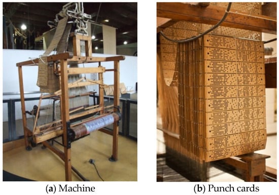 In the West, a Jacquard loom with similar functions was invented by Joseph Marie Jacquard in 1807 (Figure 6). One weaver can operate the Jacquard loom. The healds are also used to control the warps’ motions based on the repeated pattern design of the cloth. A punch card made of a piece of wood with several circle holes is used to represent a row of weft as shown in Figure 6b. A skilled worker transfers the pattern design into punched cards. These punch cards are stitched together in a continuous belt and fed into the loom. A pattern design must be generated by several pattern cards. The function of the holes on the pattern card is to move the iron stick with a circle and spring at its end. An iron hook passes through the stick’s circle and controls a warp. Therefore, for a punch card, the stick can pass through the hole without affecting the hook’s position. Then, the hook can be pulled on to draw the warp. Otherwise, for a position on the punch card without a hole, the stick is pressed, and the hook is moved out of its original position. Then, the hook cannot be pulled on, and the corresponding warp is not drawn. With the punch card, the spring can recover the stick’s position. Owing to such a design, the Jacquard loom does not need a person to draw the warps to operate the foot-raising heald mechanism, foot-falling heald mechanism, or hand-raising warp mechanism. This machine simplifies the process of manufacturing woven fabrics with complex patterns, such as brocade, damask, and matelassé [].