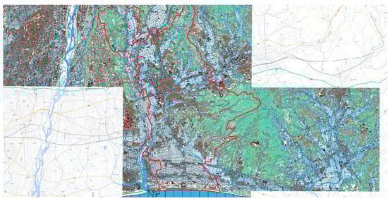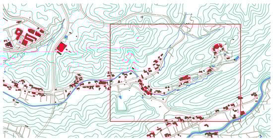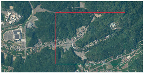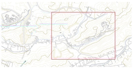 The site for the case study is shown on the map and in the aerial photo below (Figure 1 and Figure 2), which were visualized on QGIS (https://qgis.org). The specified land is located on a hilly terrain, and several settlements extend along the valleys. Geospatial data within the boundary, as shown in a red rectangle, are to be transferred to CAD systems. Both the map and the aerial photo are raster images on GIS at this stage, and vector data of varied features are needed for the development on CAD systems. The size of the bounding rectangle is 1000 m × 750 m. On QGIS, the CRS (Coordinate Reference System) of the image is set to Japan Plane Rectangular CS VIII, which covers the area over the Shizuoka Prefecture.