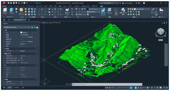 Now let us zoom into the specified land of 1000 m × 750 m for this case study (Figure 4). In this image, the map underlay is not displayed. The geospatial data of contour lines, water features, roads and buildings are all vectors consisting of coordinates of longitude and latitude. Converting those coordinate values into the local orthogonal system leads to the utilization of data in CAD and BIM systems. For this operation, we are reminded that the geospatial data are basically 2-dimensional. For instance, as for the contour data, the altitude is given as an attribute to the 2-dimensional point data.
