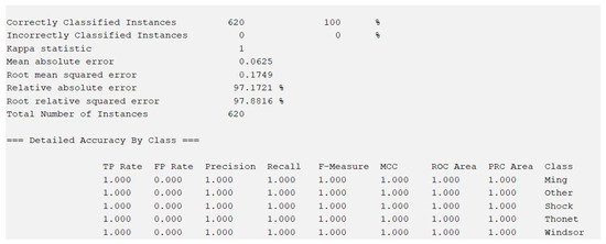 The JpegCoefficientFilter filter and the SMO classifier were tested in the first phase for image recognition and the most stability. Then, they were tested in the second phase to classify the chair styles. The accuracy of the training was 100%, which implied that the WEKA model accurately learned the images (Figure 2).