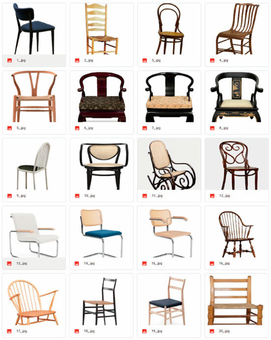 To use the WEKA model to identify the product style, appropriate images needed to be chosen for the model to learn. A total of 100 pictures of each style of the four chairs were collected as shown in Table 1. Categories were defined (Table 2) for the chairs that did not belong to these four styles to help the model detect the style of chairs accurately. The final database was imported into the data for learning. The styles of the chairs were classified into five categories (Figure 1).