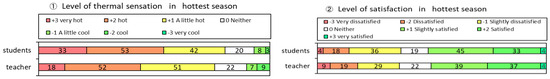 Figure 2 depicts the thermal sensations and satisfaction levels of the children, as perceived by the faculty members, as well as the thermal sensation and satisfaction levels reported by the faculty members themselves. There were no significant differences observed between the faculty’s evaluation of the children’s condition and their own evaluation. Regarding thermal sensation, approximately 75% of both the children and teachers reported feeling “hot”, while 20% of the respondents, including both children and teachers, reported feeling “very hot”. As for satisfaction levels, around 50% indicated being “satisfied”, while approximately 35% expressed some level of dissatisfaction.