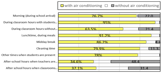 Figure 3 illustrates the operating hours and non-operating hours of the air conditioning system, as reported by the faculty members. During instructional periods when students are present or during lunchtime, the operating rate exceeds 90%. However, there is variation in the usage of the system during non-instructional periods when students are not present, such as during cleaning time or after-school hours when teachers utilize the facility. Multiple responses indicated that determining the appropriate operation during these periods is challenging for the faculty members, and it was also difficult to make definitive judgments based on the written responses.