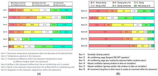 Regarding classroom ventilation, approximately 80% of the faculty members responded with ratings indicating that they consciously engage in actions such as “Opening the outer windows” (item 13) and “Opening the hallway windows” (item 15), as well as “Stirring the indoor air with a fan” (item 16). Regarding sunshade measures, the most commonly reported behavior was “Closing the curtains” (item 11), accounting for 63% of responses. As for air conditioning usage, measures such as “Pre-cooling the room in accordance with the children’s usage” (item 15) were reported by 54% of the faculty members.
