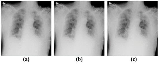 In this experimental analysis, four classes of the ‘COVID-19 Radiography Database’ were used []. Normal, viral pneumonia, lung opacity, and COVID-19 were the classes that related to CXR images. Among the most significant public datasets with 21,164 CXR images is the “COVID-19 Radiography Database”. All data are CXR images, and each image is in PNG format with the resolution of 299 × 299 pixels. Table 2 displays the number of images in the dataset.