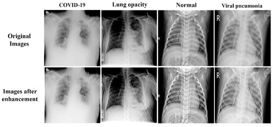 As a technique for the image enhancement process, Gabor filtering was used on the CXR image. A convolution filter called Gabor represents a term that combines sinusoidal and gaussian []. The sine element gives the directionality, whereas the Gaussian element yields the weights. The optimal parameter values were lambda = 0.785; Theta = 1.571; Gamma = 0.9; sigma = 1; phi = 0.8; ksize = 15 in Gabor filter. The variation between the original and enhanced images in the four classes is exhibited in Figure 2.
