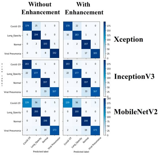 Secondly, three pre-trained CNN models (Xception, InceptionV3, and MobileNetV2) were again processed with an image enhancement technique named Gabor filtering. The hyperparameters were selected as the same as in the previous process. In a classification problem, the confusion matrix can be used to summarize prediction results. Figure 4 shows the comparison of confusion matrix plots for pre-trained CNN models with and without enhancement.