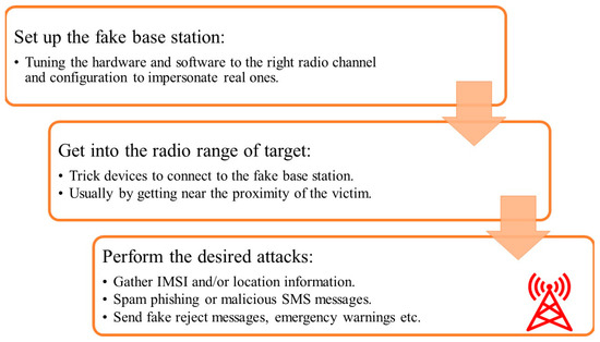 A fake base station (FBS), also known as a rogue base station (RBS), is a type of malicious device that impersonates a real base station. The main goal of the attacker is to trick UEs into connecting to unauthorized services and/or to steal the identity of the user by tracking and collecting IMSI information from the user’s devices [8]. These “IMSI-Catchers” have been spotted since the use of 2G globally. There are reports of suspicious devices appearing in major cities and records of law enforcement using similar equipment to conduct surveillance on suspects [9,10,11]. There was a recent case of using a fake BS for phishing in Taiwan. The suspects were found to have purchased the fake BS in China to transmit phishing SMS messages to trick people into giving away their credit card information. For this, they downgraded the victims’ smartphones to use 2G networks, so the victims were disconnected from the legitimate 4G/5G BS and became vulnerable to phishing messages [12]. Similar cases had been also found in China before and characterized to provide insights into the FBS spam ecosystem in China [13]. A typical procedure for using a fake BS is illustrated in Figure 2.
