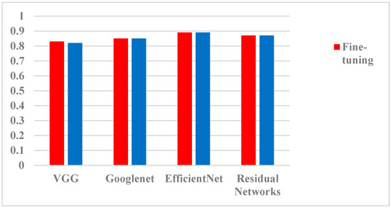The accuracy of the developed models on the test set is shown in Table 2. As a result, fine-tuning a pre-trained model improved the performance and generalization ability of the developed models by leveraging the knowledge learned from a large-scale dataset such as ImageNet. Among the four models, EfficientNet achieved the highest accuracy of 95.6% using the fine-tuning strategy, followed by Residual Networks with an accuracy of 94.8%, Googlenet with an accuracy of 93.2%, and VGG with an accuracy of 91.6%. Using the training from scratch strategy, EfficientNet also achieved the highest accuracy of 89.2%, followed by Residual Networks with an accuracy of 87.4%, Googlnet with an accuracy of 85.6%, and VGG with an accuracy of 83.2%, as shown in Figure 3.