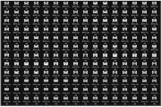 Liu [14] and Landwehr [9,15] researched the design innovation of vehicles using key features of product innovation using ML. In total, 28 frontal images of vehicles of four high-end brands (BMW, Mercedes Benz, LEXUS, and VOLVO) were collected in 2021 and 2022 for experiments. The sample images were collected from the online database of Consumer Reports issued by the American Consumer Union (CU), which is a non-profit and advertisement-free organization without any biased opinions. The database includes detailed information and images of consumer products as the source for collecting target images. The uniform image specification by Hyun [8] was employed to classify the front images of vehicles for the X-axis transformation, Y-axis transformation, and proportional transformation at different rates of 25, 75, and 100%. The morphed images were classified into training and testing sets as shown in Figure 1. The training group contained 24 deformed samples of models, while the test group consisted of four deformed samples of vehicle models.