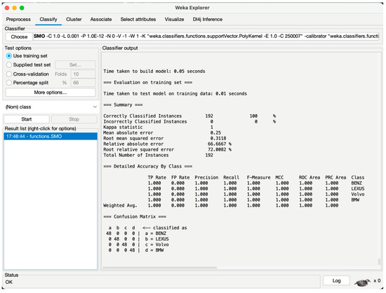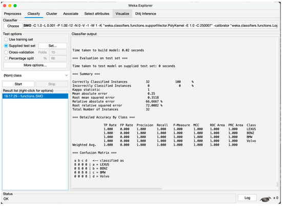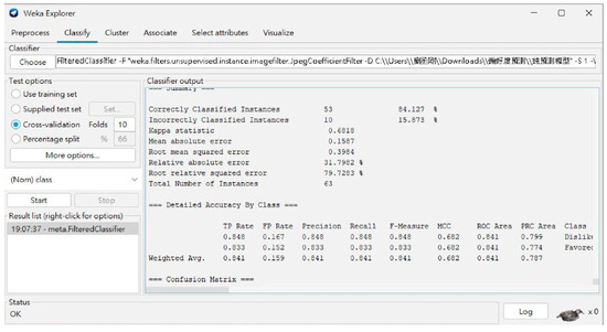 Subsequently, the grouped transformed image samples were utilized in WEKA to establish a prediction model capable of classifying the innovation level of BMW M3 models based on consumer preferences. These image samples yielded a prediction model with a classification accuracy of 84.127% after ten layers of Cross-validation, as depicted in Figure 5.